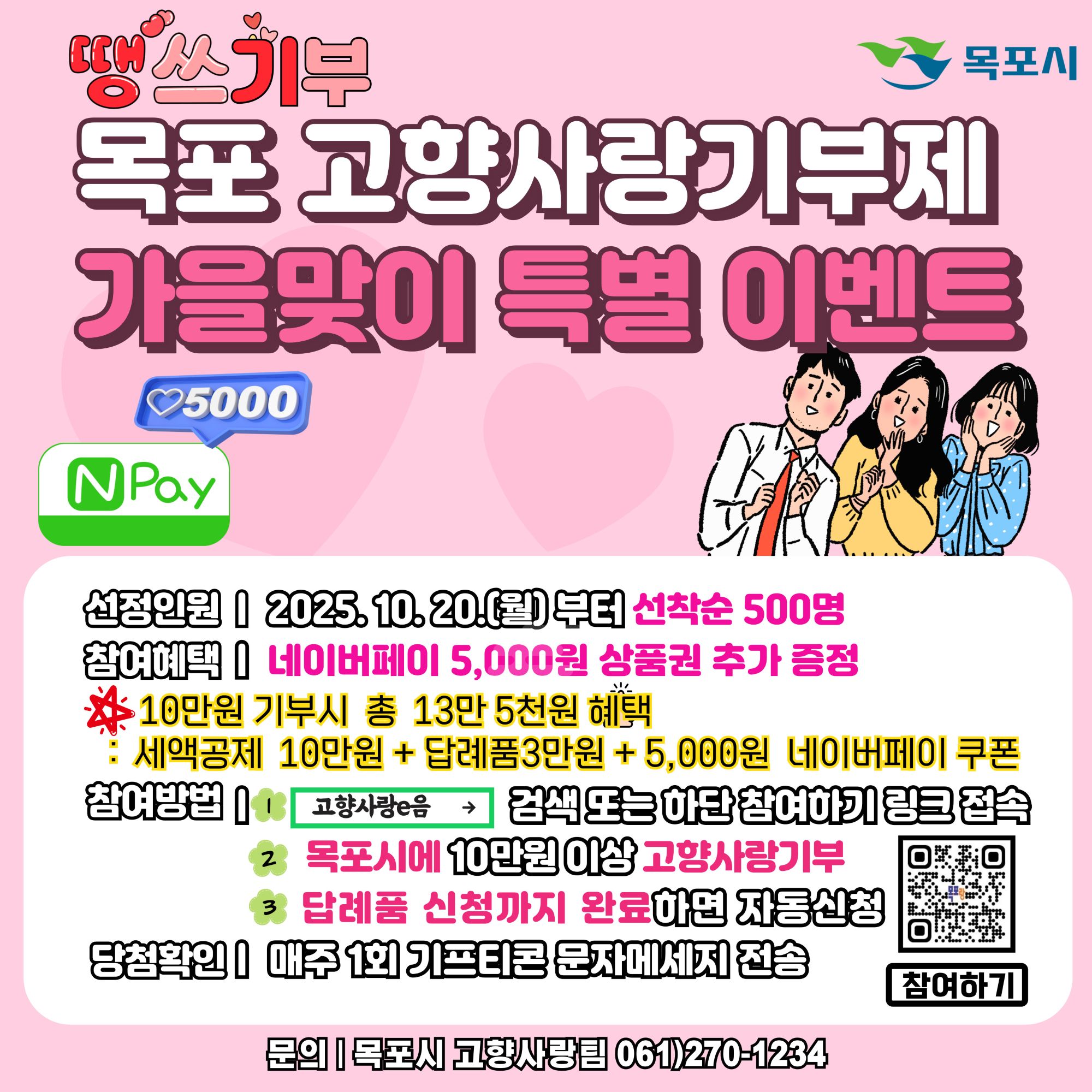 이번 이벤트는 10월 20일부터 고향사랑기부제를 통해 목포시에 10만 원 이상 기부하고 답례품을 신청한 기부자를 대상으로 하며, 별도의 응모 절차 없이 자동 참여된다. 선착순 500명에게 네이버페이 포인트 5,000원 쿠폰이 지급된다.