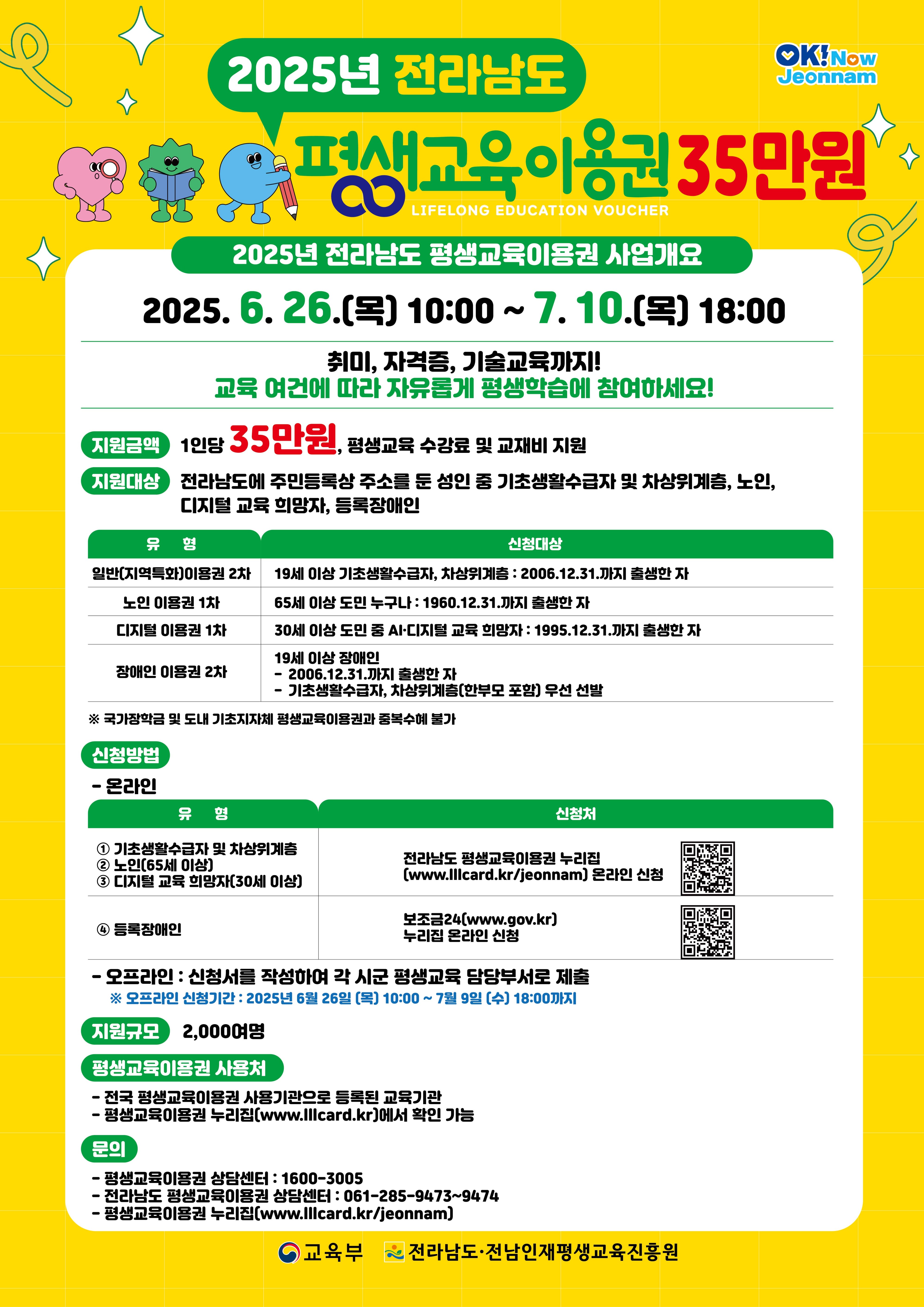 전라남도와 전남인재평생교육진흥원은 26일부터 7월 10일까지 저소득층, 인공지능(AI)·디지털 교육 희망자, 노인, 장애인 등 성인을 대상으로 2025년 전남도 평생교육이용권 대상자 2천여 명을 추가 모집한다고 밝혔다.