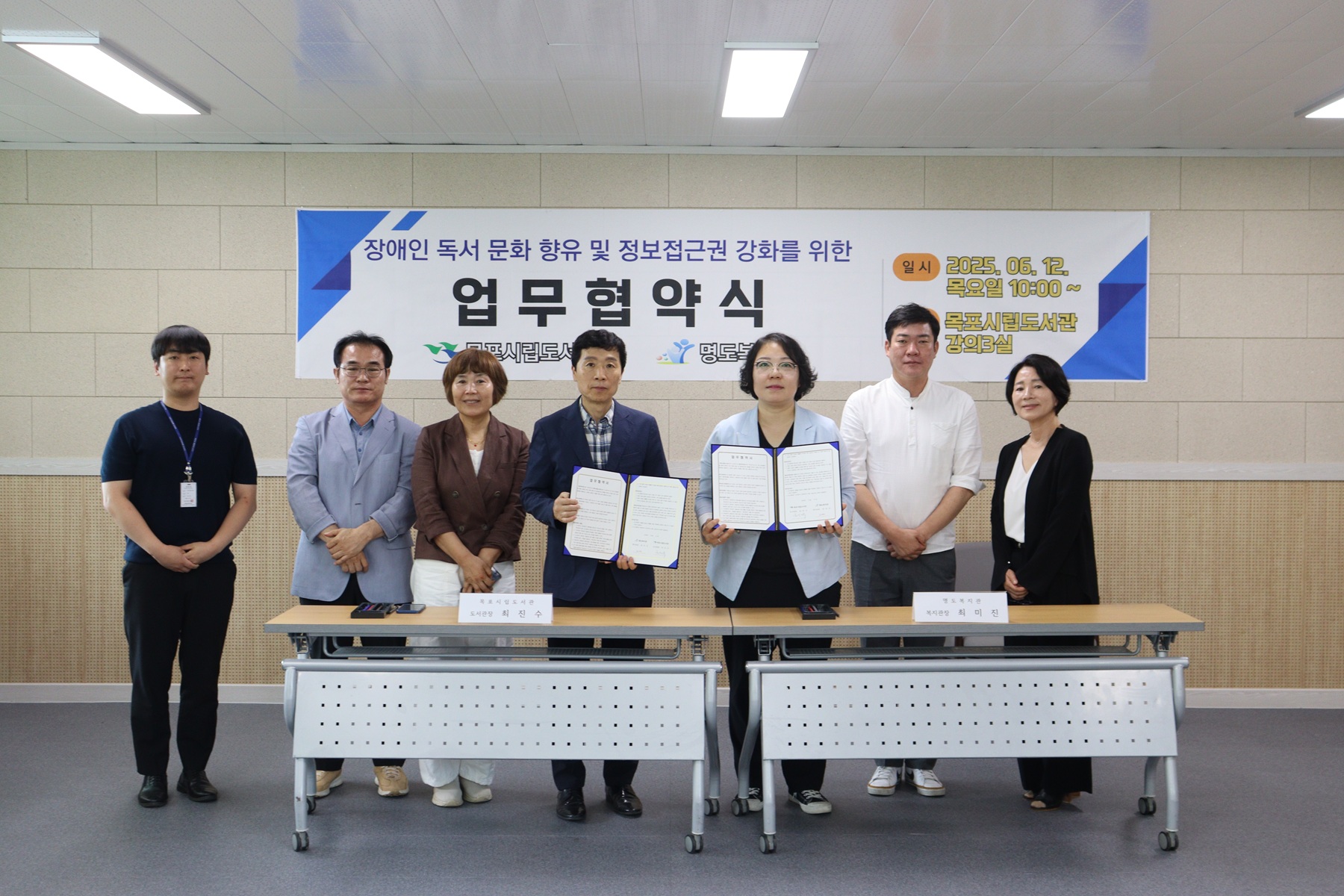 목포시립도서관(관장 최진수)과 명도복지관(관장 최미진)은 지난 12일, 장애인의 독서문화 향유와 정보 접근권 강화를 위한 업무협약을 체결했다.