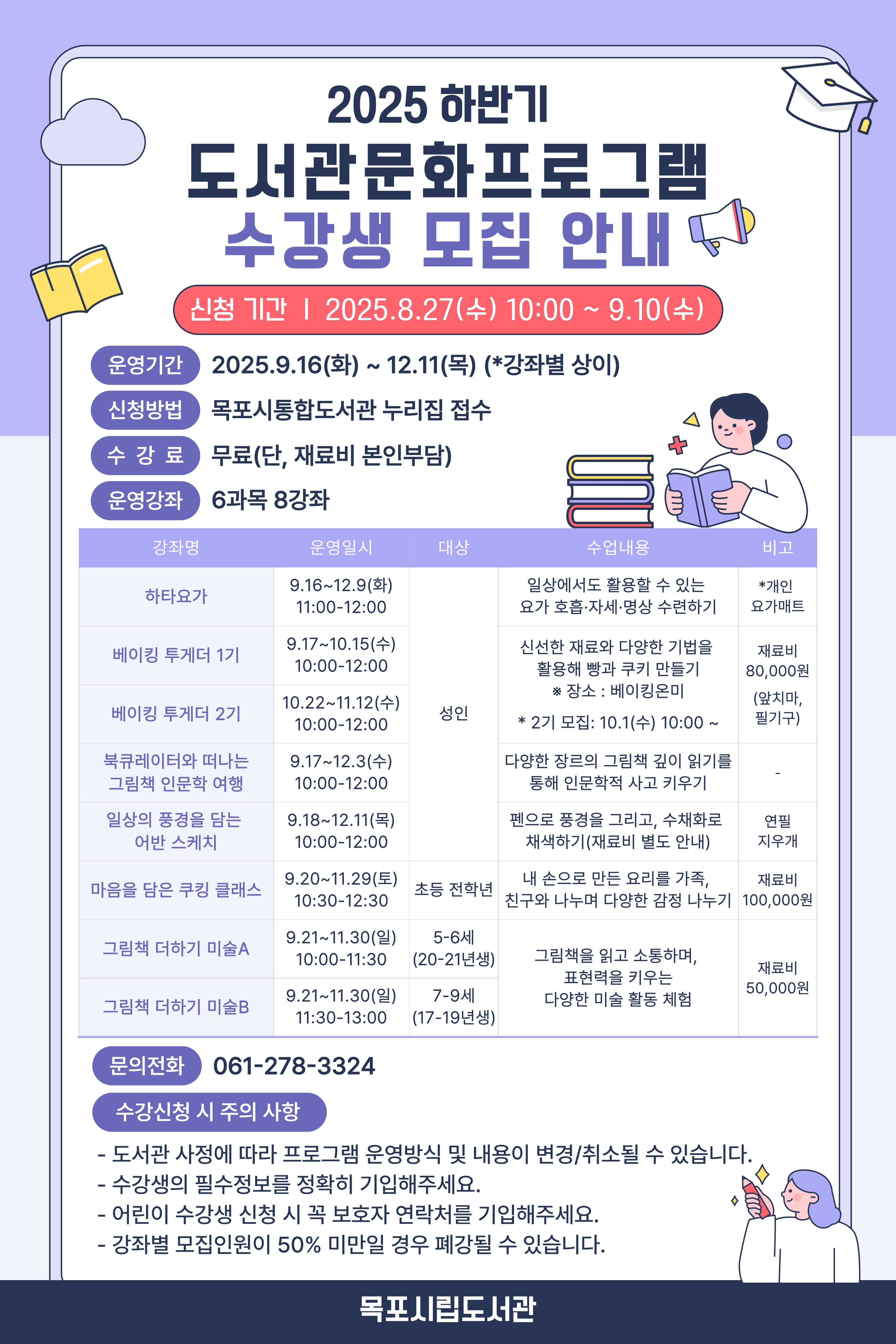 자세한 사항은 목포시통합도서관 누리집을 확인하거나 목포어울림도서관(061-270-1272)으로 문의하면 된다.